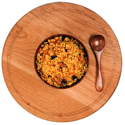 Кускус, грудка куриная, перец болгарский, морковь, лук обжаренный, чеснок, изюм, миндаль, специи (перец красный молотый, корица, куркума, паприка, соль, петрушка).